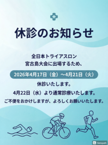 全日本トライアスロン宮古島大会に出場のため休診します。